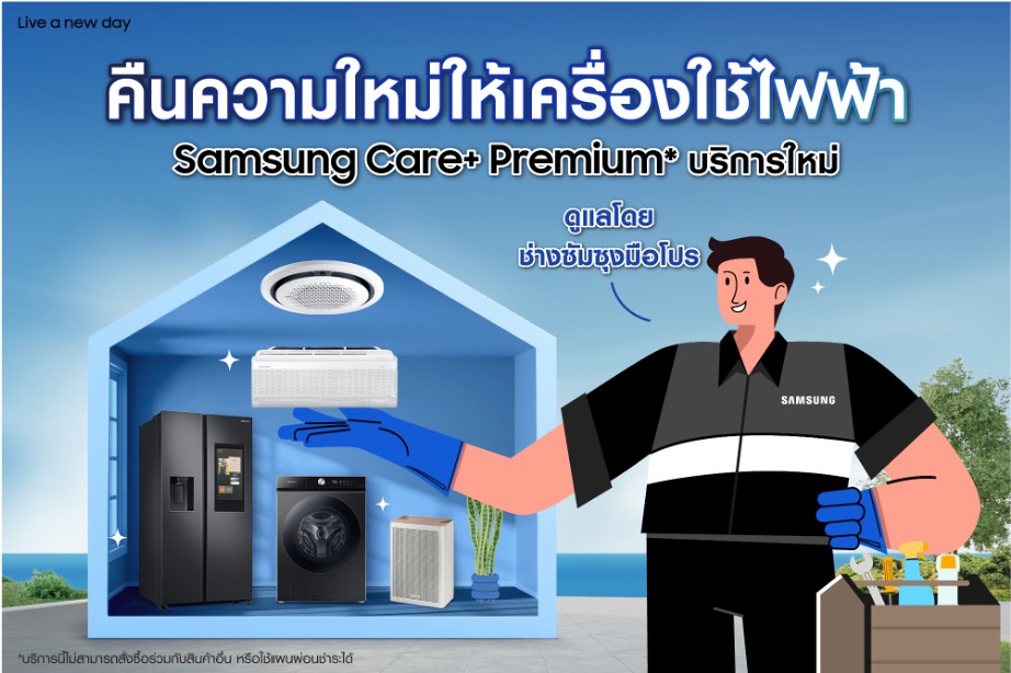 ซัมซุง พลิกโฉมมาตรฐานการดูแลเครื่องใช้ไฟฟ้า เปิดตัว “Samsung Care+ Premium” บริการดูแลเครื่องใช้ไฟฟ้าแบบ One-Stop Service ระดับพรีเมียมจากผู้เชี่ยวชาญตัวจริง รับบริการทีเดียวแต่ได้ครบทั้งตรวจเช็กสภาพเครื่องใช้ไฟฟ้า ล้างทำความสะอาด และเชื่อมต่อ SmartThings รายแรกในอุตสาหกรรม มีบริการครอบคลุมเครื่องใช้ไฟฟ้าทั้งเครื่องปรับอากาศ ตู้เย็น เครื่องซักผ้า เครื่องอบผ้า และเครื่องฟอกอากาศ ให้สะอาดเหมือนใหม่ ทำงานเต็มประสิทธิภาพสูงสุด และยืดอายุการใช้งานอย่างเหนือระดับ โดยทีมงานมืออาชีพจากซัมซุงและพร้อมรับประกันคุณภาพหลังการบริการนานถึง 60 วัน
