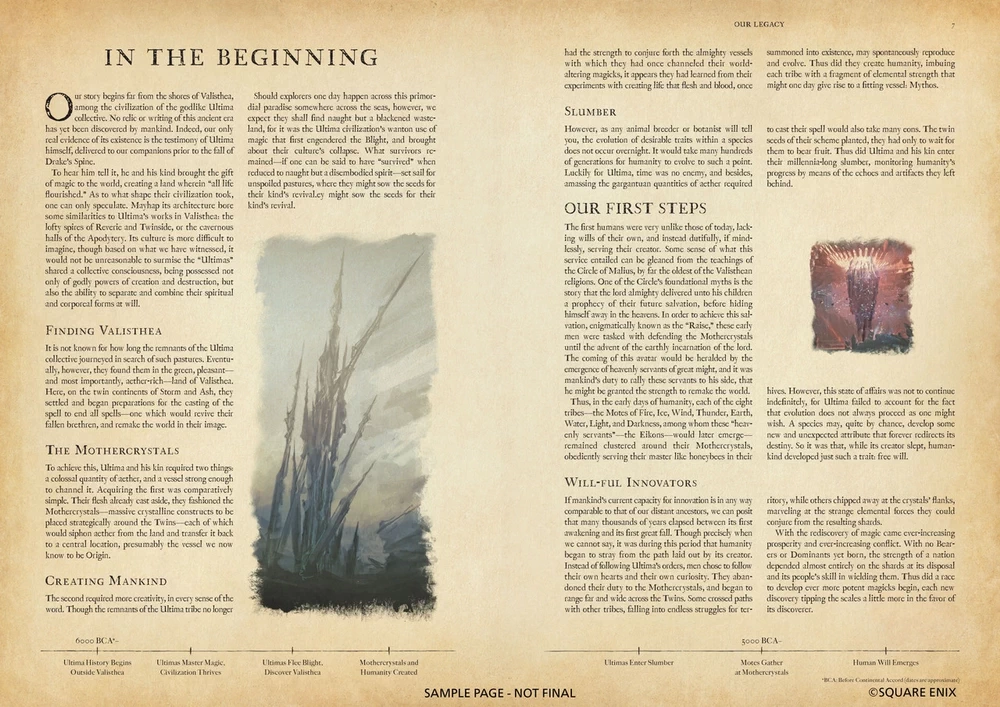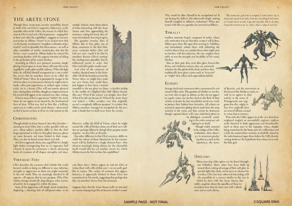 Koji Fox เผยว่า Kazutoyo Maehiro ผู้อำนวยการฝ่ายสร้างสรรค์ของ Final Fantasy XVI มอบหมายให้เขาและนักแปล John Taylor เขียนคู่มือฉบับภาษาอังกฤษขึ้นก่อน โดยในตอนแรกเขาคิดว่าจะเป็นเพียงผู้แปลเท่านั้นเหมือนกับที่เคยทำใน Final Fantasy XIV Encyclopedia Eorzea คู่มือแบ่งออกเป็น 5 บทหลัก ได้แก่ ประวัติศาสตร์ของโลก เรื่องราวของ Dominants และ Eikons สถานที่ Clive’s Hideaway เนื้อหาเกี่ยวกับ Mothercrystals และสุดท้ายข้อมูลของแต่ละชาติใน Valisthea