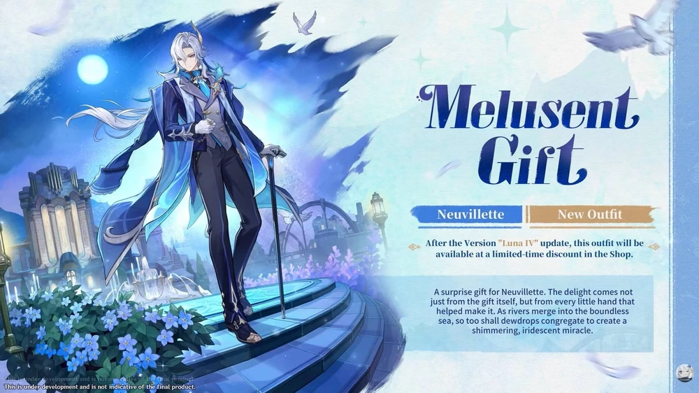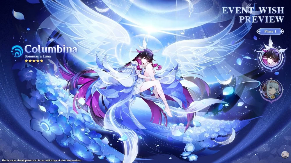 การอัปเดตครั้งนี้จะมาพร้อมตัวละครระดับ 5 ดาวใหม่สองตัว ได้แก่ Columbina และ Zibai โดย Columbina จะเน้นการเล่นที่เกี่ยวข้องกับปฏิกิริยา Lunar ขณะที่ Zibai จะช่วยเสริมศักยภาพของปฏิกิริยาใหม่ Lunar-Crystallize ซึ่งเป็นผลลัพธ์ที่เกิดจากการผสมผสานธาตุ Geo และ Hydro โดย Columbina จะปรากฏในช่วงครึ่งแรกของอัปเดตร่วมกับ Ineffa ส่วน Zibai จะมาในช่วงครึ่งหลังร่วมกับ Neuvillette ที่มาพร้อมสกินใหม่ และในแบนเนอร์เดียวกันยังมีการเปิดตัวตัวละครระดับ 4 ดาวใหม่อย่าง Illuga ด้วย