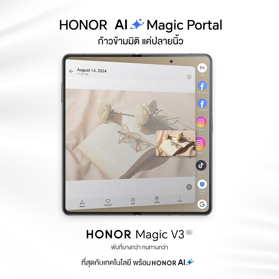 ออเนอร์ (HONOR) ผู้ให้บริการอุปกรณ์อัจฉริยะชั้นนำระดับโลก เดินหน้ารุกตลาดสมาร์ตโฟนจอพับในประเทศไทย มุ่งขยายกลุ่มลูกค้าระดับไฮเอนด์ ด้วยการเปิดตัวสมาร์ตโฟนจอพับระดับแฟลกชิป HONOR Magic V3 ภายใต้สโลแกน “พับที่บางกว่า ทนทานกว่า” ชูโรงด้วยดีไซน์บางเฉียบและทนทานที่สุดในโลก บางเพียง 9.2 มิลลิเมตร เมื่อพับ และ 4.35 มิลลิเมตร เมื่อกางออก ผสานแบตเตอรี่ซิลิคอนคาร์บอนที่บางแต่ให้ความจุจัดเต็มถึง 5150mAh พร้อมเสริมพลังด้วย HONOR AI อัจฉริยะ เพื่อประสบการณ์การใช้งานที่ราบรื่น พร้อมฟีเจอร์ Circle to Search with Google เพิ่มความสะดวกในการค้นหาในทุกสถานการณ์ ตลอดจนยกระดับการใช้งานด้วยการดีไซน์จากวัสดุประสิทธิภาพสูงอย่าง HONOR Anti-scratch NanoCrystal Shield และ IPX8 Waterproof เปิดตัวในราคา 54,990 บาท และพิเศษสุดกับโปรโมชันช่วงพรีออเดอร์ระหว่างวันที่ 15 - 23 ตุลาคม 2567 สามารถนำมือถือรุ่นใดหรือยี่ห้อใดก็ได้มาแลก รับส่วนลดสูงสุด 10,000 บาท* พร้อมประกันหน้าจอแตก 1 ปี* เริ่มจำหน่ายตั้งแต่วันที่ 24 ตุลาคม 2567 เป็นต้นไป