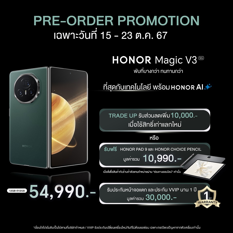 พาเข้าสู่ยุคใหม่ของสมาร์ตโฟนจอพับที่บางเท่ากับบาร์โฟน! HONOR Magic V3 บางเบากว่า ทนทานกว่า พร้อมเปิดประสบการณ์การใช้งานสุดล้ำกับ HONOR AI ในราคา 54,990 บาท พิเศษ! Pre-order 15-23 ต.ค. นำมือถือเครื่องเก่ามาแลก รับส่วนลดสูงสุด 10,000 บาท พร้อมประกันหน้าจอแตก 1 ปี